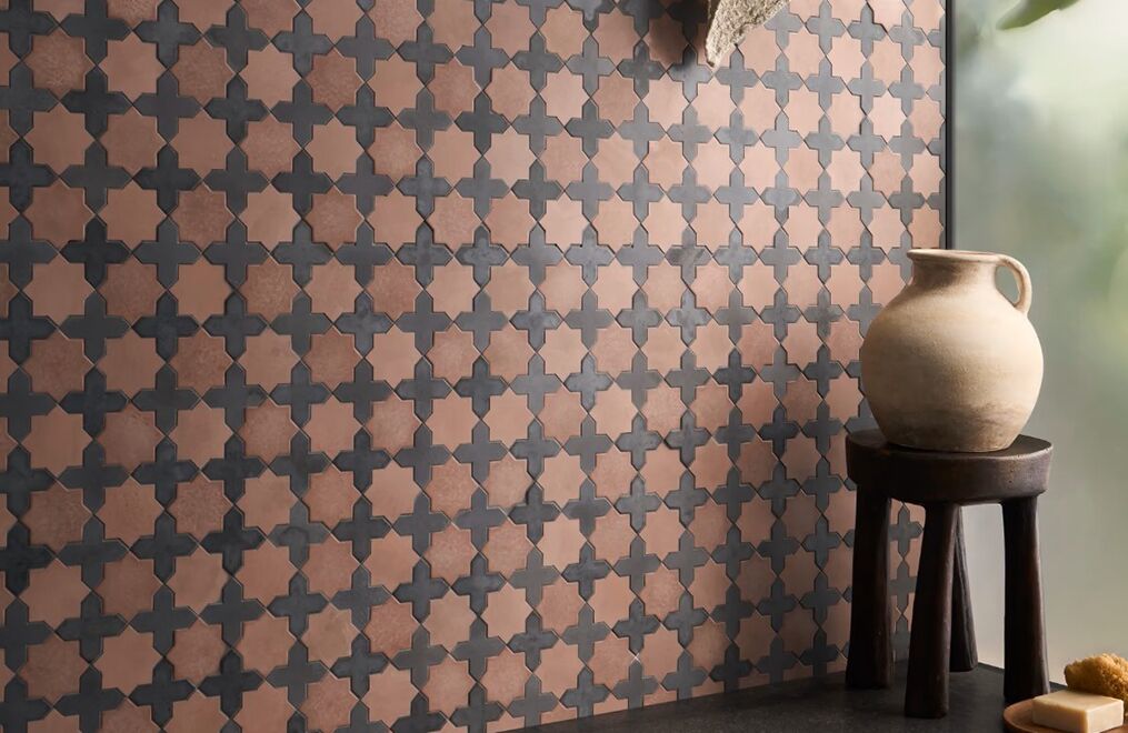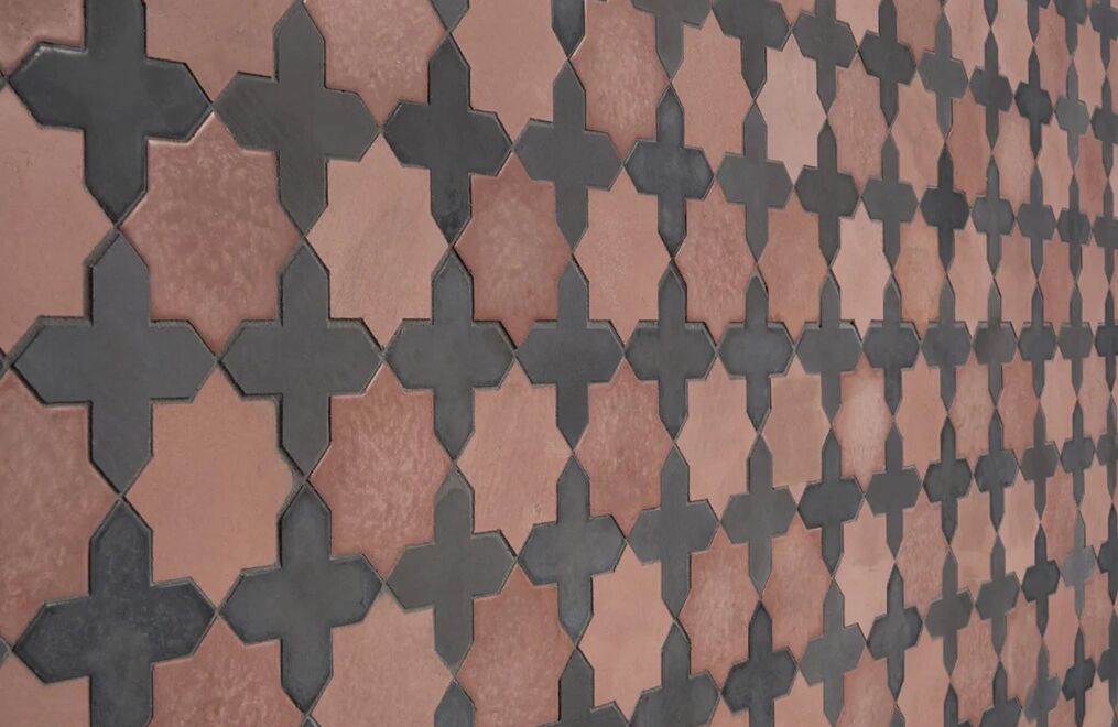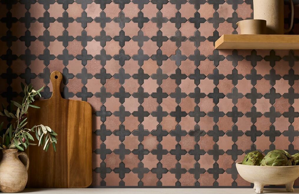 The Alpana Mara Lava Stone and Cement Mosaic offers a modern twist on a timeless Moroccan pattern. This contemporary interpretation of a traditional geometric look in a rich terracotta hue has modern appeal. The combination of materials in this contemporary mosaic adds an appealing graphic contrast.