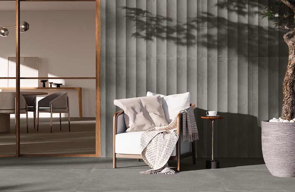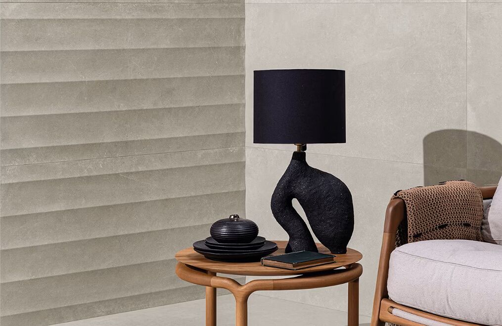 The collection pays tribute to stately columns and facades in warm, neutral hues. Each large-format tile comes in two options: flat or lightly fluted. When side by side, the fluted version creates subtle dimension, adding unique texture to walls. The flat versions act as the perfect complement on floors—or on walls where a smooth surface is desired.