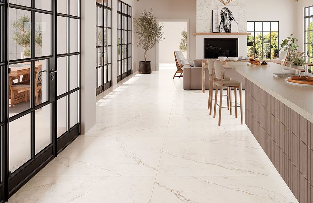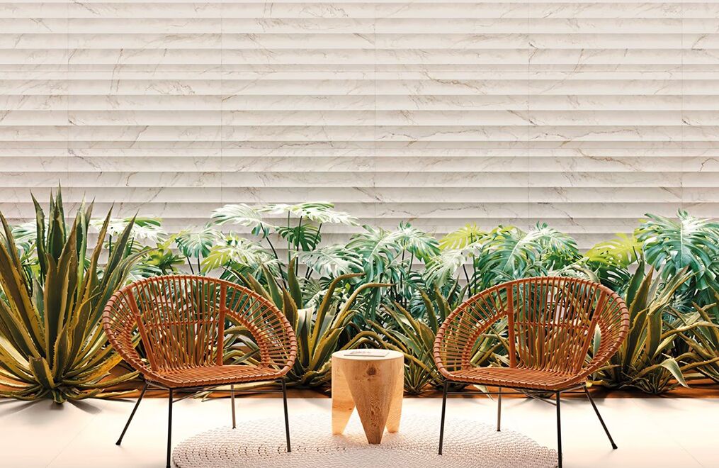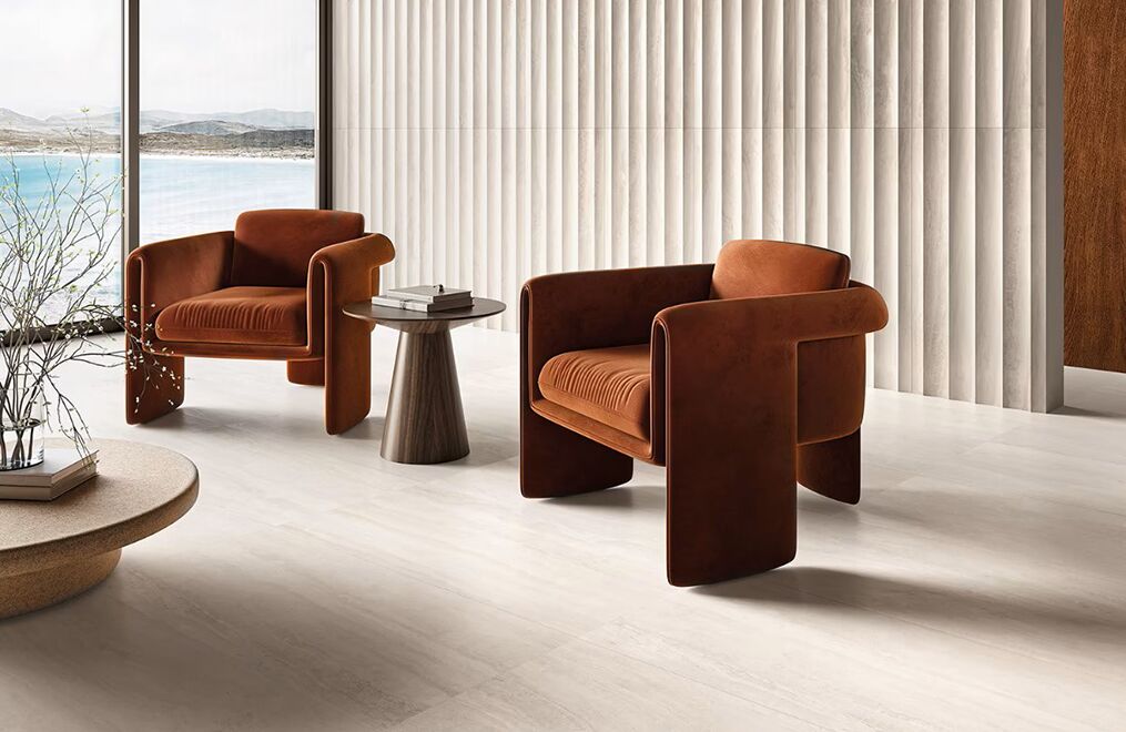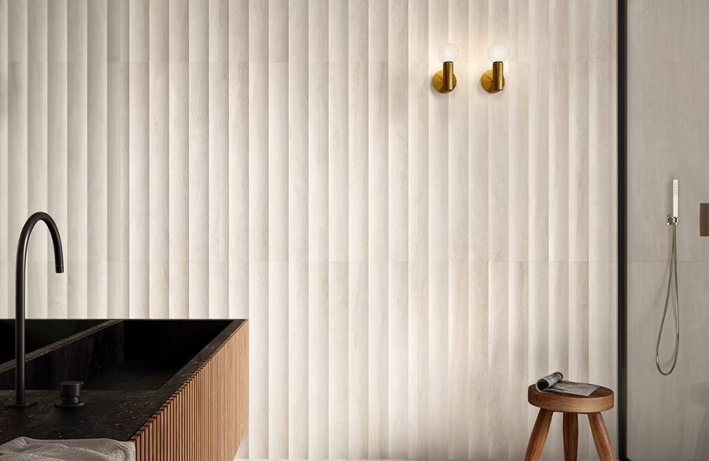 The Bellamar collection pays tribute to classic travertine and marble in warm, romantic hues. Each 24″x48″ large-format tile comes in two options: flat or lightly fluted. When side by side, the fluted version creates subtle dimension, adding unique texture to walls. The flat versions act as the perfect complement on floors—or on walls left smooth.