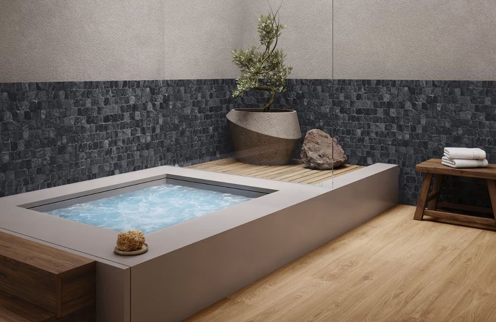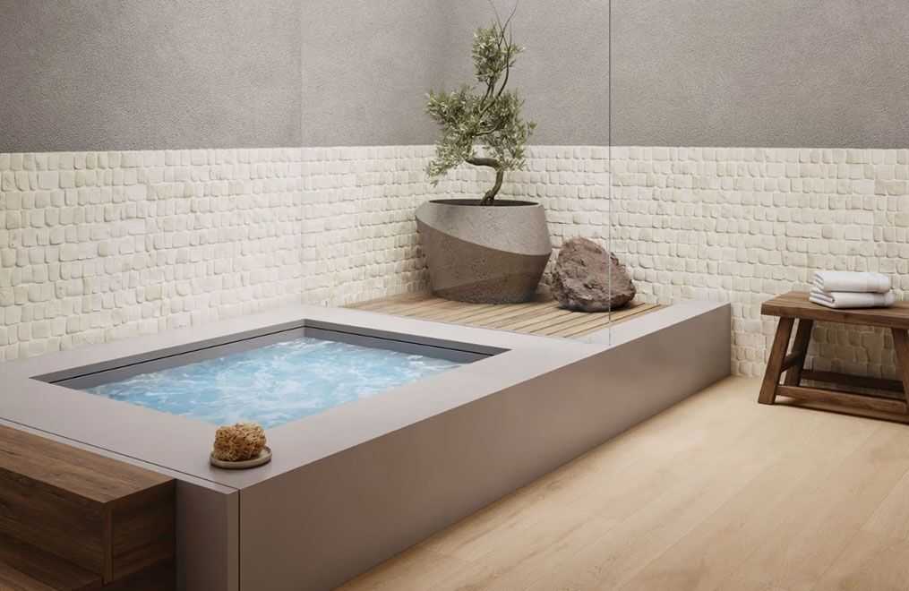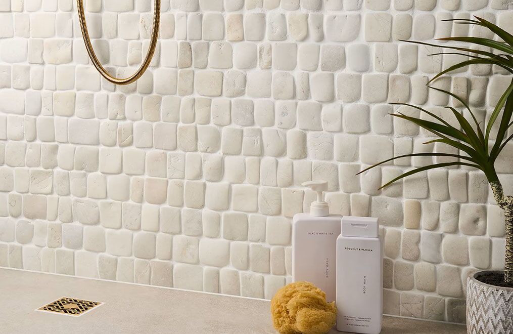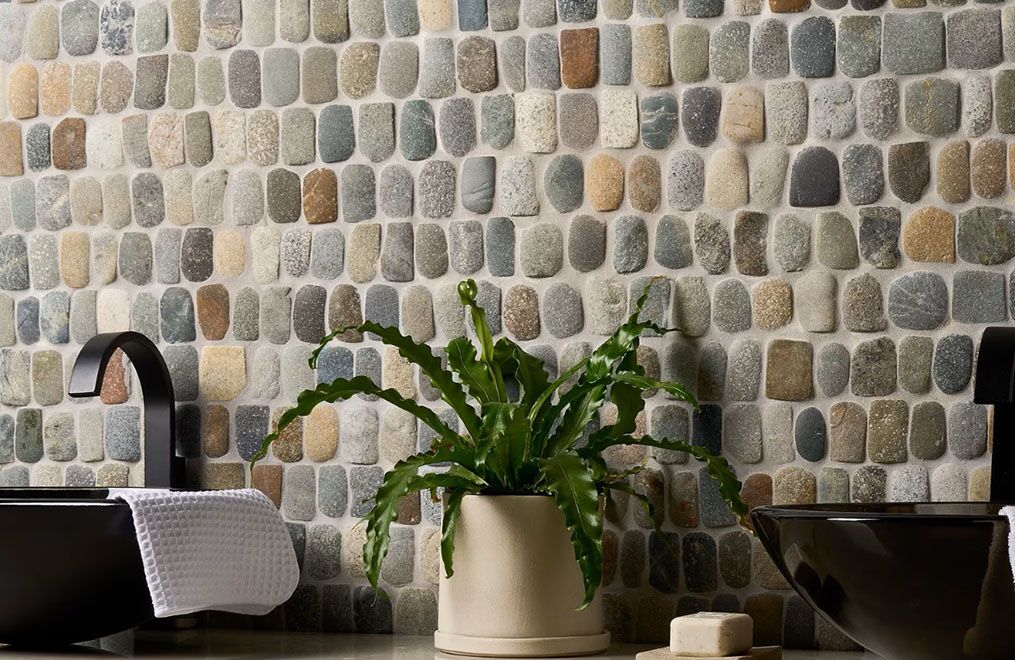 Nothing channels the soothing spa vibe quite like natural stone. Our Pebblestone Pathway collection translates genuine pebblestone into a texture that’s calming and Zen-like. What’s more, the artful color combinations lend the rustic material an elevated look, so it works in modern spaces just as easily as more traditional ones.