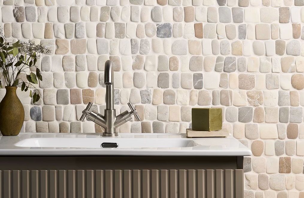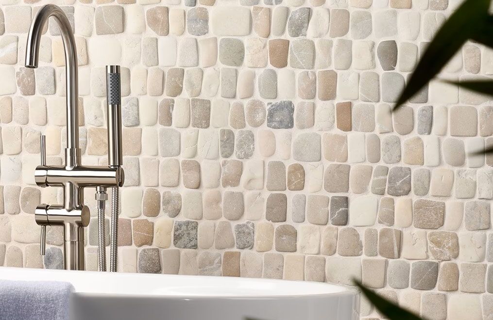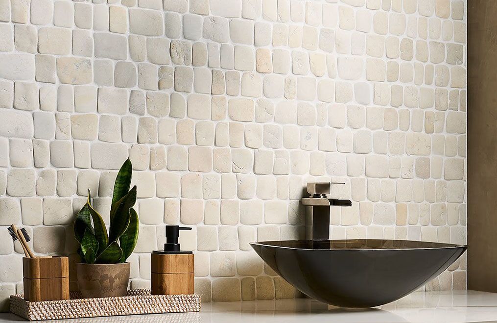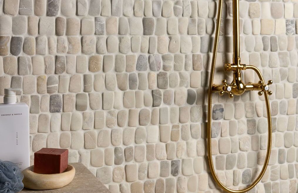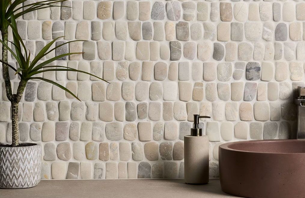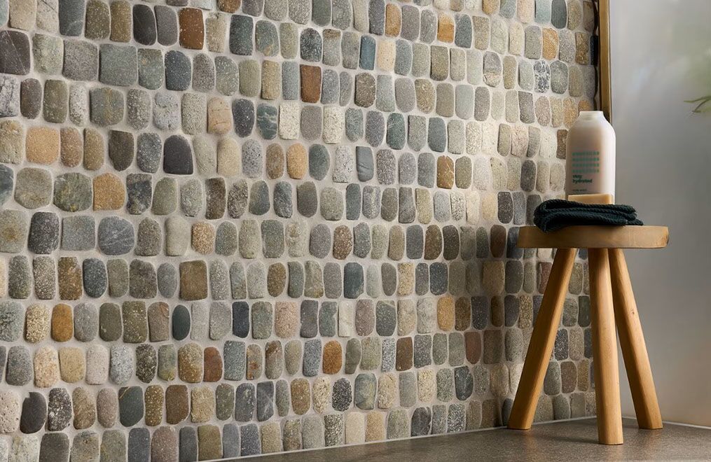 Like river pebbles worn down by years of exposure to the elements, this collection achieves its smooth, rounded edges by tumbling natural pebblestones. The stones are then carefully sorted and hand-placed on a mesh backing. The honed finish retains its authentic, rustic look.