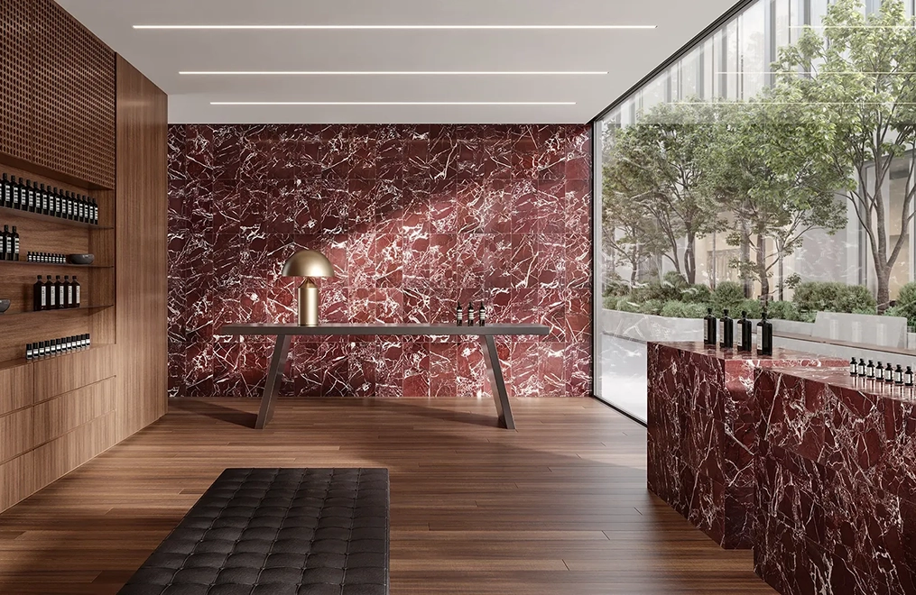 Intricate maroon marble with bold and delicate veining creates a rich and vivid canvas. This stunning deep maroon marble is both luxurious and captivating. The dark, rich tones are complemented by delicate white veins that highlight the stone, resulting in a striking contrast against the vivid maroon backdrop.