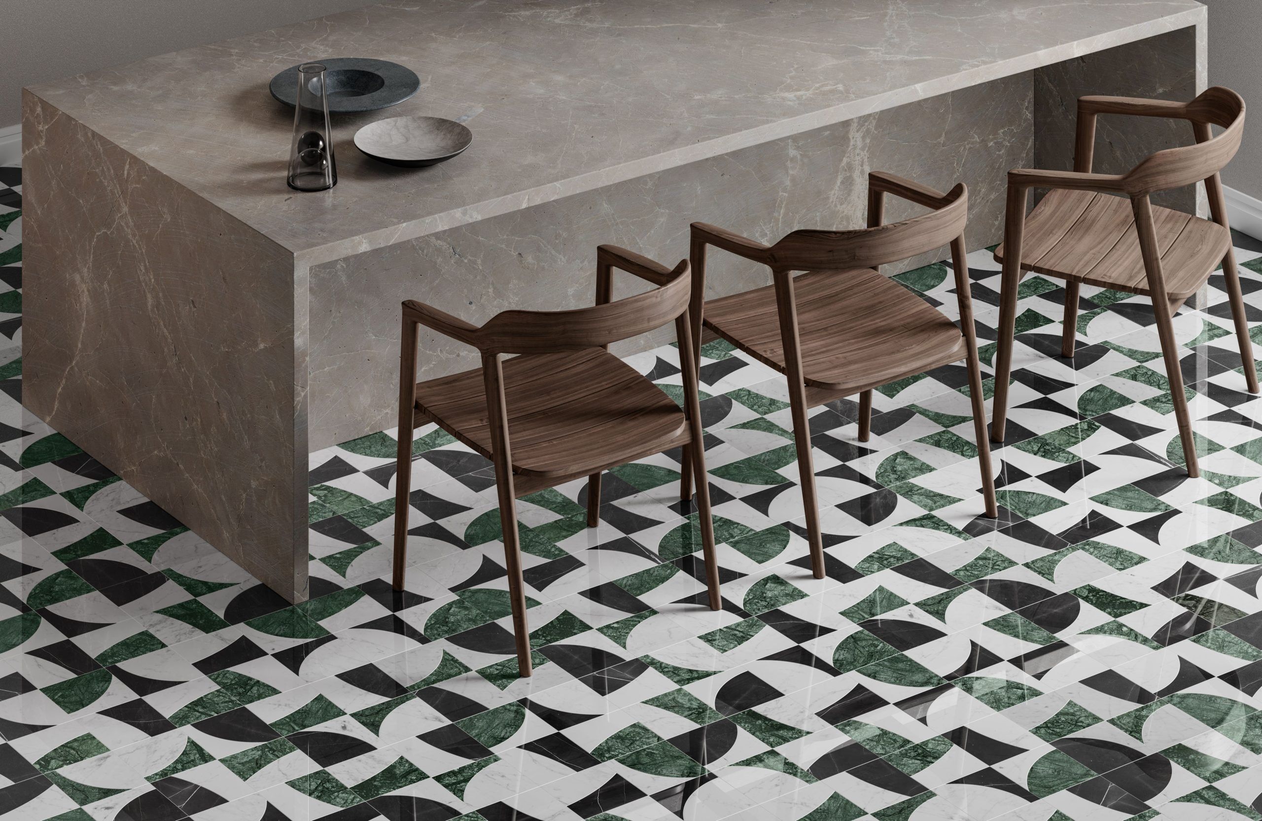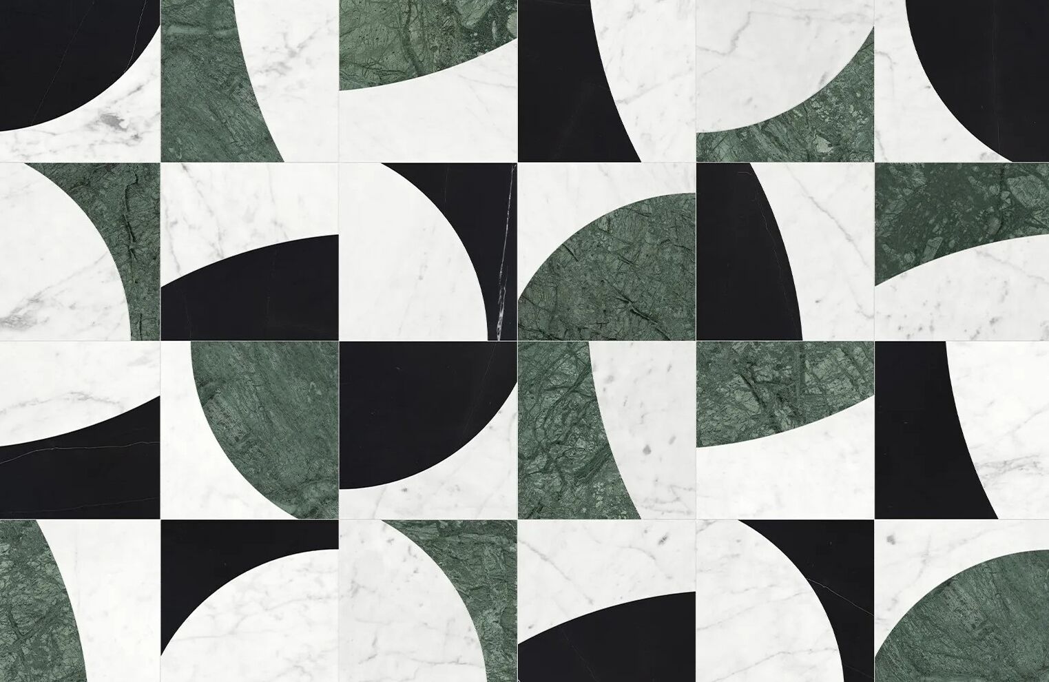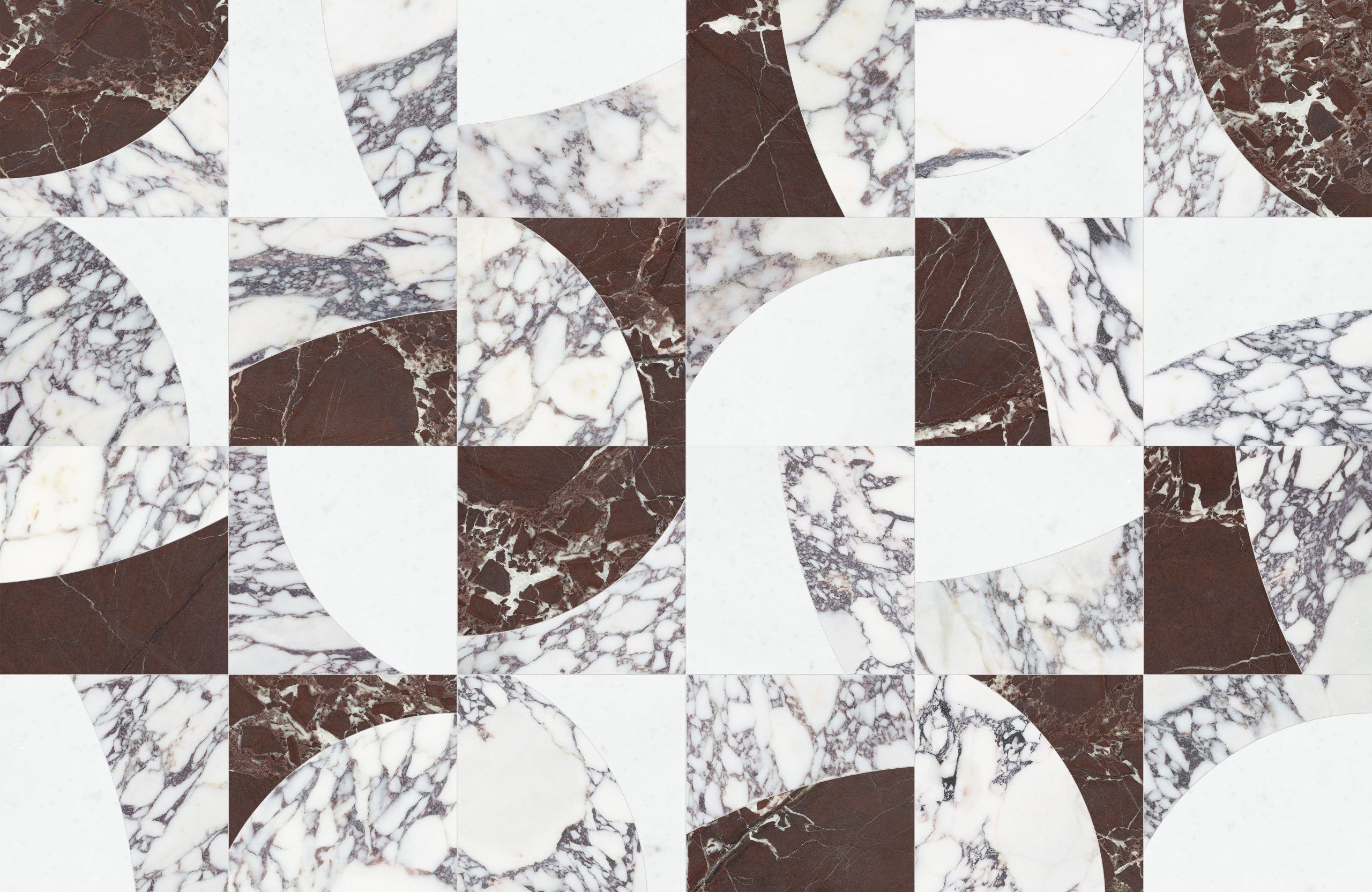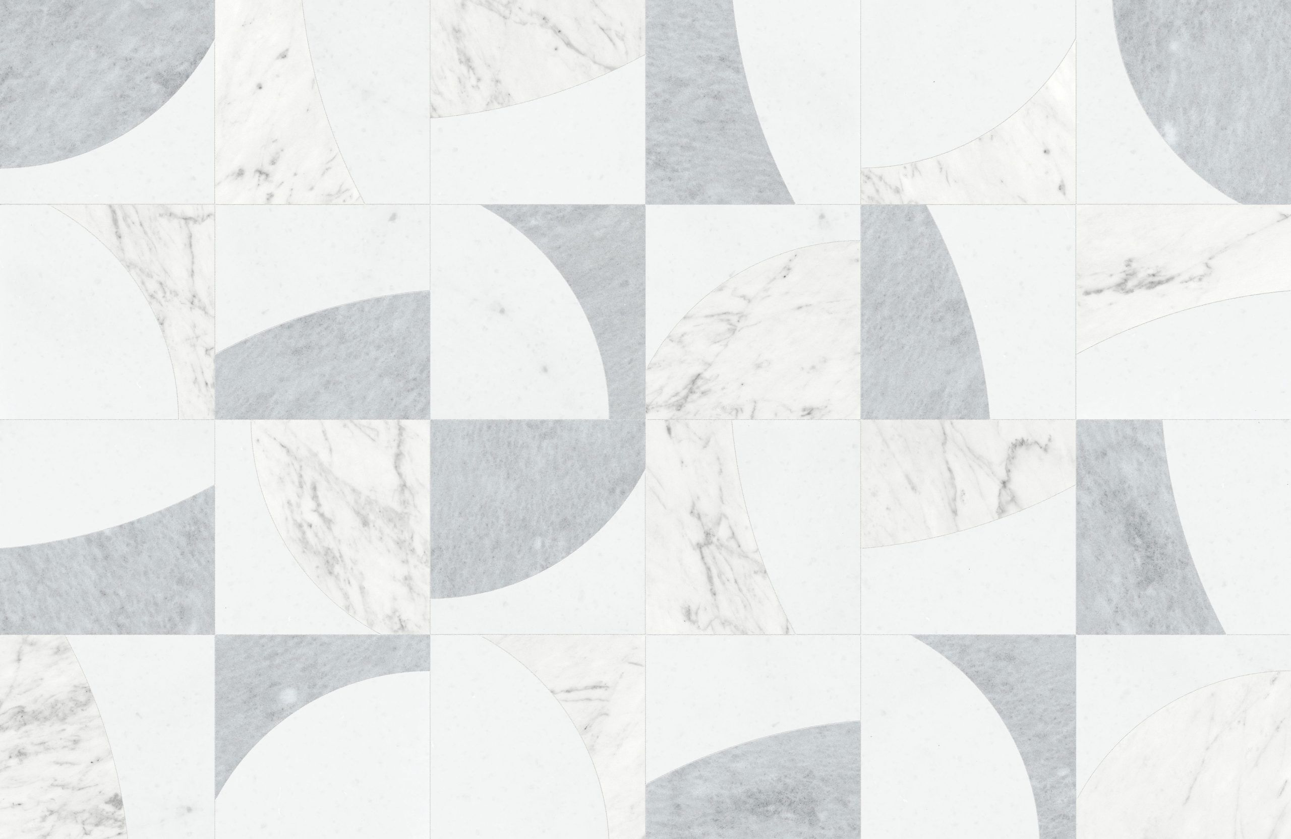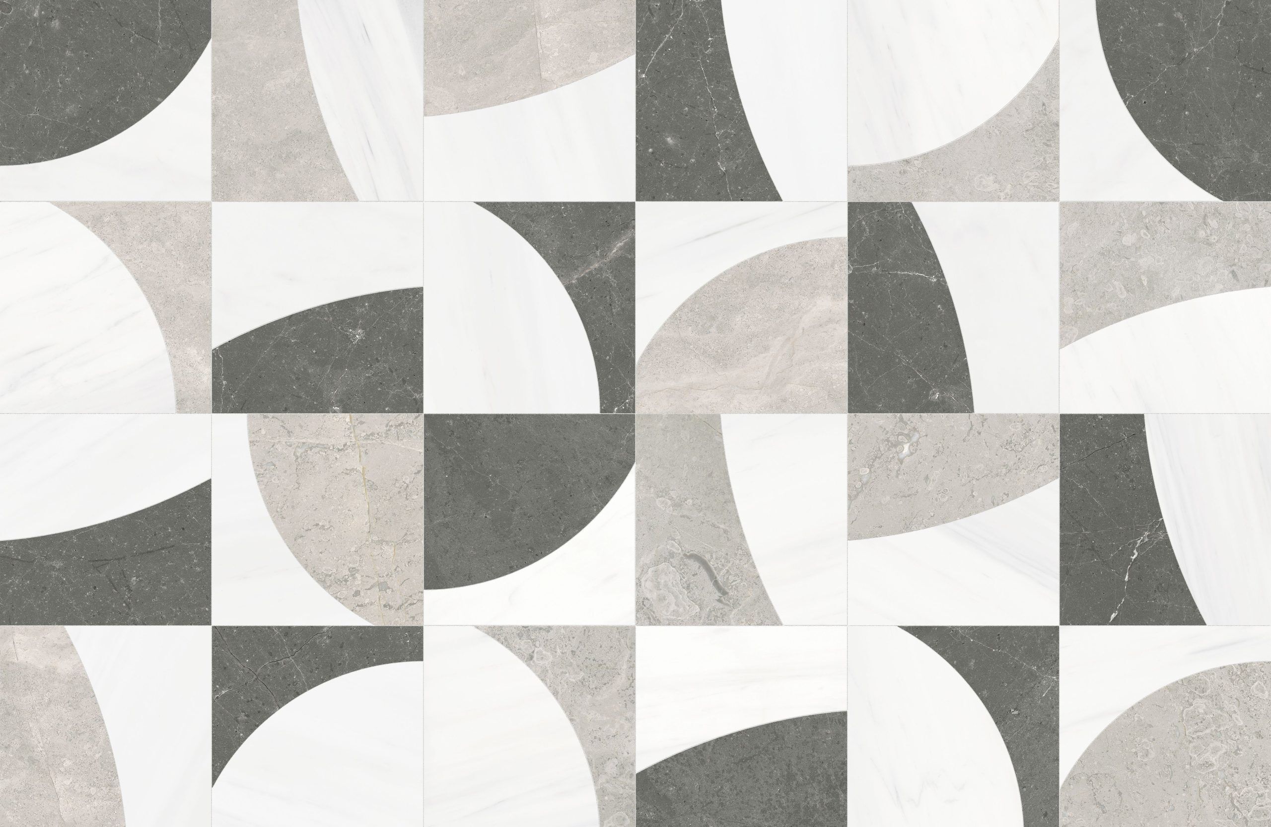 The variegated design of this mosaic resembles the ever-changing phases of the lunar cycle, presented in an abstract expression. The design coupled with its inverted counterpart allows for a sense of infinite potential.